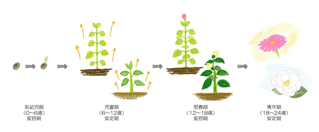 ・12~18歳の思春期は、葉が茂って、つぼみが付いて、成熟に近づく時期。〈変容期〉